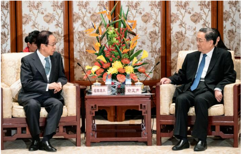 2015年,俞正聲同志會見來華參加由中國外文局和日本言論NPO共同主辦的“北京—東京論壇”的日本前首相福田康夫一行