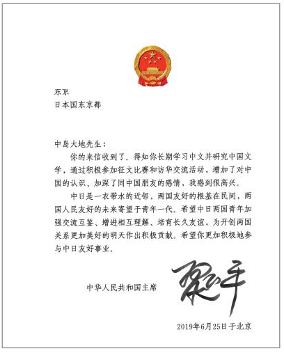 2019年6月,中國國家主席習近平給在“熊貓杯”日本青年征文大賽中獲獎的日本青年中島大地回信,寄望中日兩國青年為開創兩國關系美好明天作出積極貢獻?!靶茇埍比毡厩嗄暾魑拇筚悇撧k于2014年,由中國外文局人民中國雜志社、中國駐日本大使館和日本科學協會共同主辦,旨在讓日本青年更加全面、客觀、理性地了解中國。