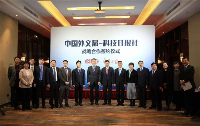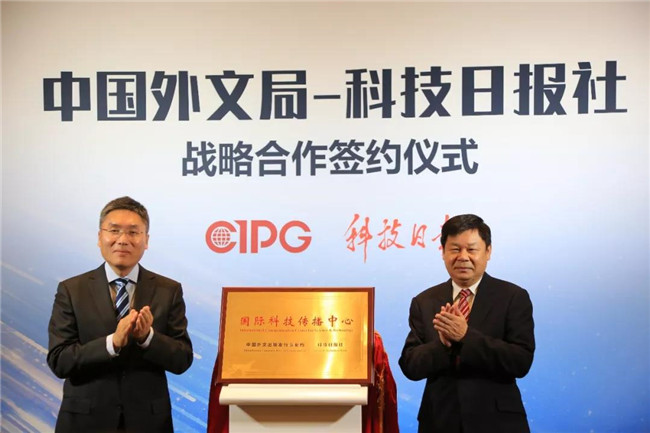 在活動現場,中國外文局副局長高岸明與科技日報社副社長房漢廷簽署了戰略合作協議,聯合工作機構——國際科技傳播中心正式揭牌成立。