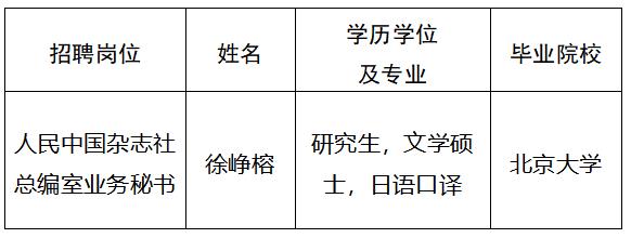 根據事業單位公開招聘工作有關規定和《中國外文出版發行事業局所屬企事業單位2020年度公開招聘工作人員簡章》,現將中國外文局所屬人民中國雜志社2020年度擬聘用事業單位工作人員予以公示。公示期間,如有問題,請向中國外文局反映。