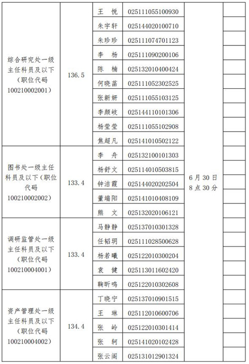 報考總編室綜合研究處一級主任科員及以下(職位代碼100210002001)、總編室圖書處一級主任科員及以下(職位代碼100210002002)、計劃財務部調研監管處一級主任科員及以下(職位代碼100210004001)、計劃財務部資產管理處一級主任科員及以下(職位代碼100210004002)職位的考生進行面試。