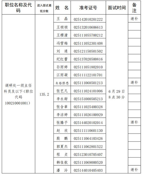 報考辦公室調研處一級主任科員及以下(職位代碼100210001001)職位的考生進行面試。