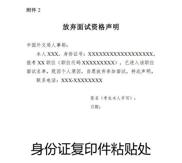 放棄面試的考生請填寫《放棄公務員面試的聲明》(詳見附件2),經本人簽名,于6月12日17時前傳真至010-68990820或發送掃描件至shwyuan@cipg.org.cn。未在規定時間內填報放棄聲明,又因個人原因不參加面試的,視情節將上報中央公務員主管部門記入誠信檔案。
