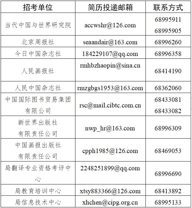 (一)報名。有意報考者請訪問中國外文局官方網站(http://www.cipg.org.cn/),并于2020年6月16日8:30至7月3日24:00期間通過郵箱投遞簡歷。用人單位的簡歷投遞郵箱和聯系方式見附件。