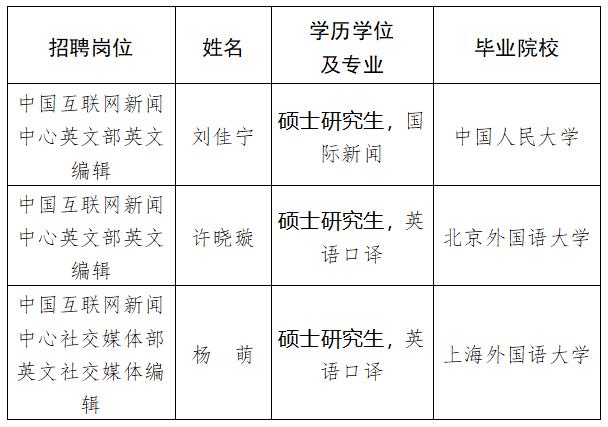 根據事業單位公開招聘工作有關規定和《中國外文局所屬企事業單位2020年度公開招聘工作人員簡章》,現將中國外文局所屬中國互聯網新聞中心2020年度擬聘用事業單位工作人員予以公示。公示期間,如有問題,請向中國外文局反映。