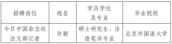 根據事業單位公開招聘工作有關規定和《中國外文出版發行事業局所屬企事業單位2020年度公開招聘工作人員簡章》,現將中國外文局所屬今日中國雜志社2020年度擬聘用事業單位工作人員予以公示。公示期間,如有問題,請向中國外文局反映。