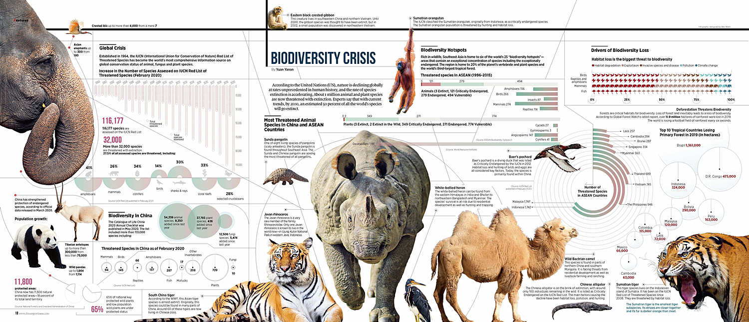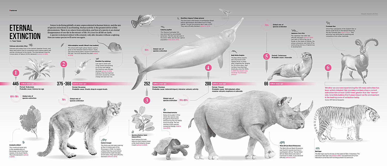 本組圖表由中國外文局所屬中國報道雜志社制作,巧妙地通過色彩將現存生物與滅絕生物進行區分,形成了強烈的視覺沖擊力和良好的信息傳達的層次感。