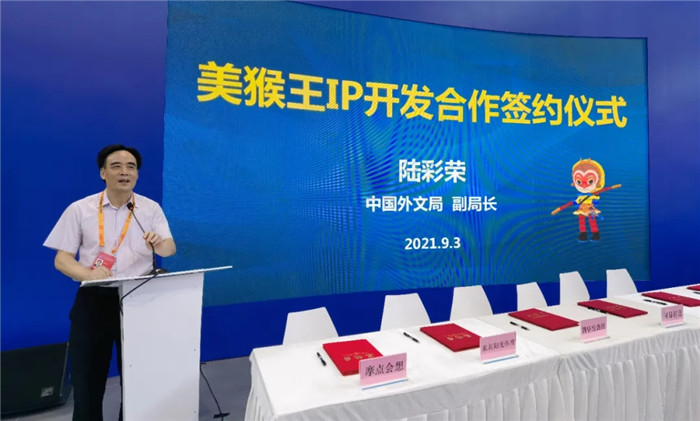 9月3日,朝華出版社在2021年中國國際服務貿易交易會中國外文局展臺舉行美猴王IP開發合作簽約儀式。中國外文局副局長陸彩榮見證簽約并致辭。朝華出版社社長汪濤主持簽約活動。