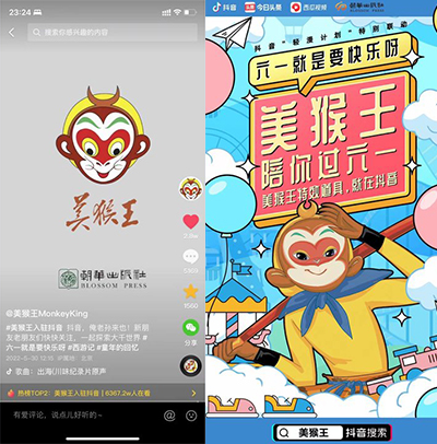5月30日,朝華出版社“美猴王”賬號入駐抖音平臺,引起廣大網友熱烈關注,24小時內“美猴王”首條視頻穩居抖音熱榜前列,話題熱度高達6000多萬,視頻播放量達200多萬。目前粉絲8.3萬,獲點贊6.8萬,有10多家公司私信洽商合作。抖音平臺在兒童節當天以開屏廣告形式為賬號推流。