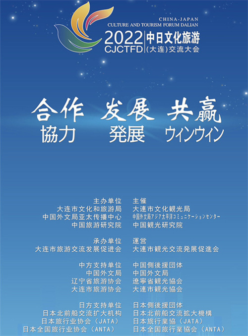 5月26日,由大連市文化和旅游局、中國外文局亞太傳播中心、中國旅游研究院主辦,大連市旅游交流發展促進會承辦的2022中日文化旅游(大連)交流大會在富麗華大酒店成功舉辦。交流大會以“合作·發展·共贏”為主題,設有開幕式和主旨演講兩個部分,首次以線上線下相結合方式實現與會嘉賓“云端”相聚。