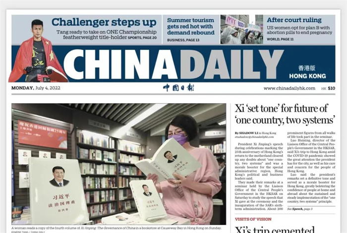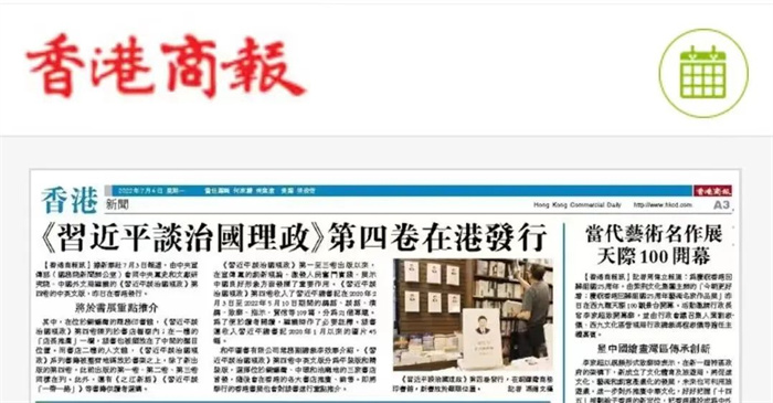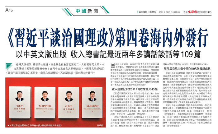 7月3日,由中央宣傳部(國務院新聞辦公室)會同中央黨史和文獻研究院、中國外文局編輯的《習近平談治國理政》第四卷中英文版在香港發行。
