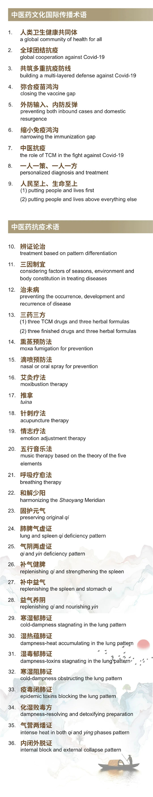 中國外文局翻譯院負責人介紹,此次發布的36條術語,既包括“人類衛生健康共同體”“人民至上、生命至上”等來自中醫藥文化國際傳播工作中的常用術語,也有“辨證論治”“三藥三方”等來自中醫藥抗疫過程中的常用術語。36條術語均提供了最大程度忠實于中文本意,同時又便于國外受眾理解的英文翻譯,其中個別條目提供了兩種英文譯法。