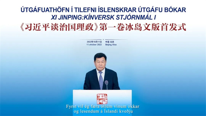 杜占元在視頻致辭中表示,《習近平談治國理政》展示了習近平主席對中國國家治理和全球治理問題的深入思考,體現了推動構建人類命運共同體、共建美好世界的中國方案。這部著作冰島文版的出版,將為更多冰島讀者讀懂習近平新時代中國特色社會主義思想打開新的窗口,為推動中國與冰島兩國文明互鑒架設理解之橋。閱讀這部著作,能夠更深入地理解和感知中國共產黨以人民為中心的發展思想、中國式現代化的發展實踐,以及中國始終倡導和平、發展、公平、正義、民主、自由的全人類共同價值。
