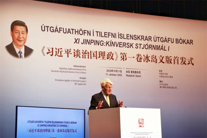 格里姆松在致辭中回顧了他與習近平主席交往的故事,稱通過兩人的直接接觸,他對習近平主席的治國理政理念留下深刻印象。格里姆松對《習近平談治國理政》第一卷冰島文版的問世表示歡迎。他說,《習近平談治國理政》不同語種版本的出版發行就像是中國與全世界進行的一場對話,該書的冰島文版本將進一步促進中冰兩國和兩國人民間的相互理解和友好交往,而讀懂中國對當今乃至未來世界發展都至關重要。