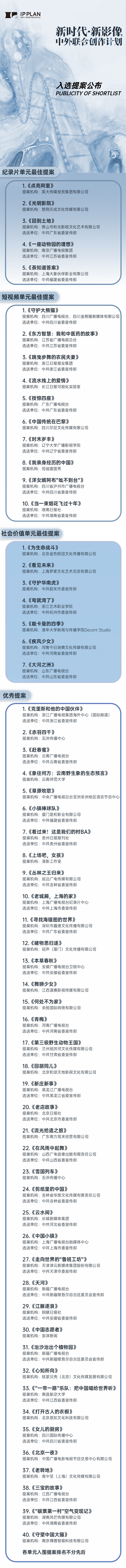 日前,“新時代 新影像”中外聯合創作計劃公布提案評選結果,即將全面啟動拍攝階段。首屆創作計劃共評選出“紀錄片單元”最佳提案5個,“短視頻單元”最佳提案10個,“社會價值單元”最佳提案7個,“優秀提案”40個。