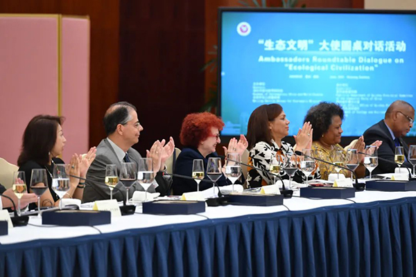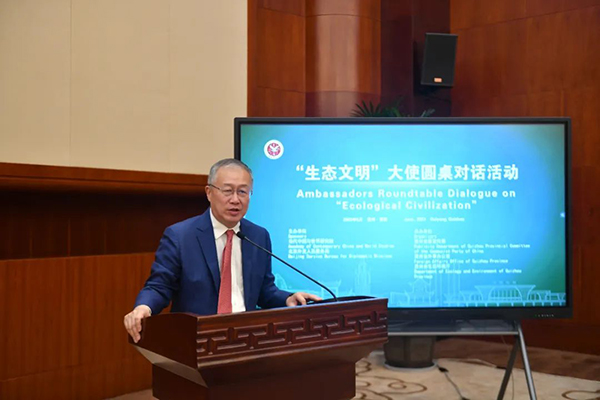 6月6日,“生態文明”大使圓桌對話活動在貴州舉行,中國外文局副局長于濤、北京外交人員服務局局長李立出席活動并致辭。貴州省副省長張敬平,科技部原副部長劉燕華,國家氣候變化專家委員會副主任、第十四屆全國人大常委會委員王毅及來自20個國家的駐華使節、國際組織代表出席并圍繞“現代化進程與生態文明建設”主題進行研討交流。