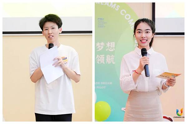 現場的兩位大運會志愿者代表,來自電子科技大學的陳書林、賀夢凡分享了他們作為志愿者的心路歷程以及與大運會的不解之緣。參與大運會志愿服務的工作讓他們親身體會到“敢于筑夢,不懈追夢,終將圓夢”的經歷,更深刻地感受到“成都成就夢想”所承載的情感。他們表示,“已經做好了充分準備,并將持續準備著,為向世界呈現一屆具有中國特色、彰顯時代風采、展現巴蜀韻味的體育盛會而不懈努力”。