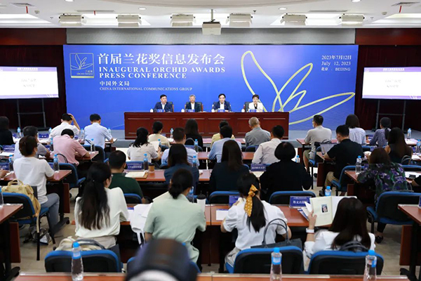 7月12日,首屆蘭花獎信息發布會在北京舉行。中國外文局副局長、首屆蘭花獎評委會副主任委員陸彩榮,中國美術家協會主席、首屆蘭花獎評委會副主任委員范迪安,中國外文局副總編輯、蘭花獎秘書處秘書長陳實出席發布會,正式公布首屆蘭花獎入圍名單,發布蘭花獎標識,通報評選表彰工作整體情況,并回答中外記者提問。中國外文局綜合業務部主任、蘭花獎秘書處副秘書長辛峰主持發布會。