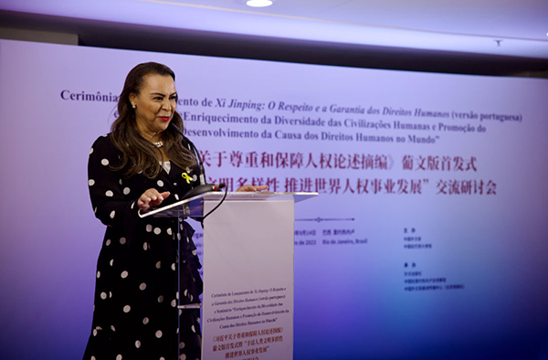 蒂婭·茹說,巴中嘉賓共同見證了一部重要著作的首發,著作中習近平主席關于人權的重要論述將幫助國外讀者更好理解中國人權事業的發展,也引發讀者對未來如何進一步推動世界人權事業發展進行思考。中國人權事業發展緊密地結合著中國的現實,提高億萬中國人民的生活水平,是中國共產黨和中國政府最關心的議題。民生改善、教育健康事業發展和生態文明建設等,都是中國尊重人權、發展人權的實際體現。人權事業發展是一個全球化的議題,巴西應進一步加強同中國的人權發展合作,通過持續的努力,參與和推動全球人權治理。