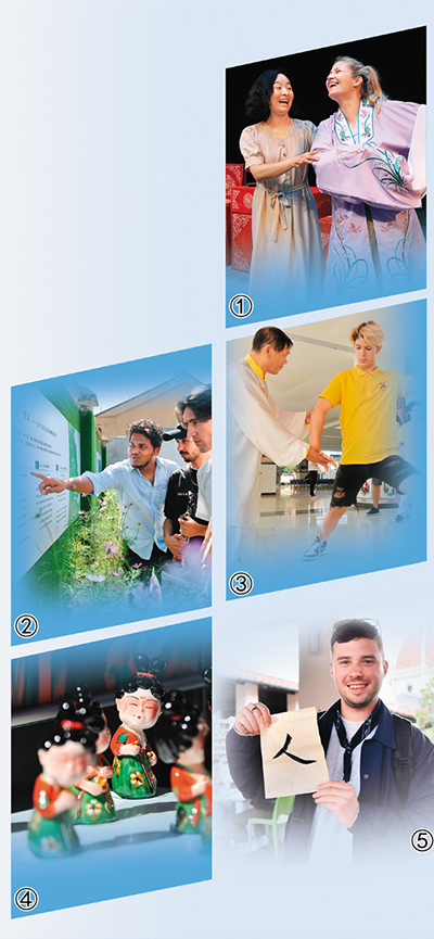 圖①:9月9日,在山東省東營市呂劇團的舞臺上,國際友人在呂劇藝術表演者的指導下,“沉浸式”體驗國家級非物質文化遺產呂劇的魅力。周廣學攝(人民視覺)