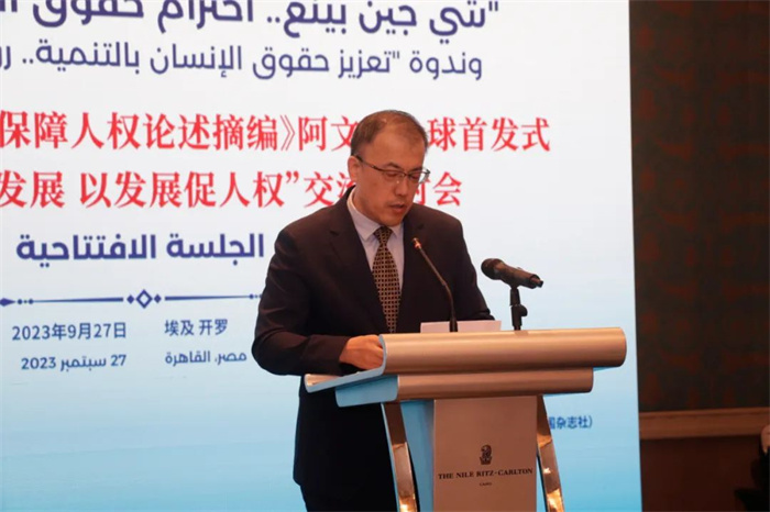 穆尼爾·法西在致辭中首先代表阿盟秘書長蓋特對與會嘉賓表示問候,并轉達了他對中阿戰略伙伴關系與中阿深厚歷史文明聯系重要性的肯定。他高度贊揚了習近平主席關于人權的論述,特別是創造性地提出了“一帶一路”倡議與“全球發展倡議”,在實現民生福祉與社會正義上產生極為積極的效應;同時他表示,《習近平關于尊重和保障人權論述摘編》阿文版的出版促進了中阿兩大文明體系的交流。他認為,發展是一項與生俱來的人權,正如《阿拉伯人權憲章》所述那樣,發展與人權相輔相成,就是需要增強人權文化的意識。