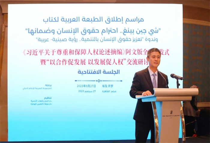 在研討會上,外文出版社編輯總監楊春燕,埃及外交委員會執行主任伊扎特·薩阿德,埃及國家人權委員會委員伊薩姆·西哈,阿盟阿拉伯研究院、蘇丹扎伊姆·艾資哈利大學國際關系學院教授伊克拉姆·穆罕默德·薩利赫作了現場發言,中央黨校人權研究中心主任張曉玲和中國社會科學院人權研究中心執行主任柳華文以視頻形式發言。來自中國、埃及、蘇丹、巴林、摩洛哥等國及阿盟的政界、學術界、文化界、媒體出版界等各界代表約100人參加了活動。