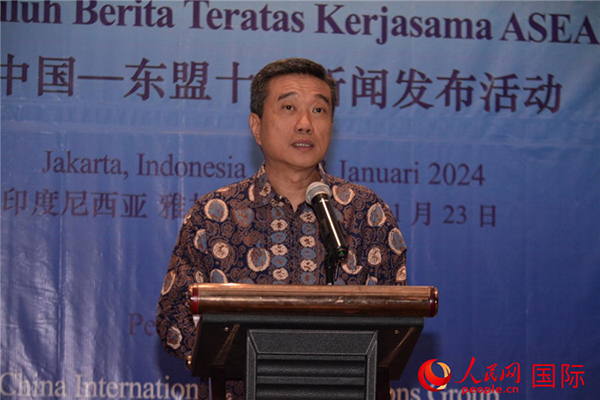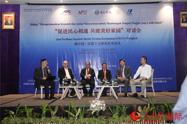 人民網雅加達1月24日電 (記者李培松、曹師韻)1月23日,中國—東盟人文交流年系列活動之“促進民心相通 共建美好家園”對話會暨中國—東盟十大新聞發布活動在印度尼西亞首都雅加達舉行。本次活動以“交流 理解 互信 共贏”為主題,由中國外文局指導,中國外文局亞太傳播中心、外交學院、印度尼西亞總統大學、亞太智庫、華電海外投資有限公司聯合主辦,獲得了泰國國家研究院泰中戰略研究中心、華電(印尼)玻雅公司、亞洲領袖通訊社、廣西外國語學院等智庫、媒體和駐印尼中資機構的支持。