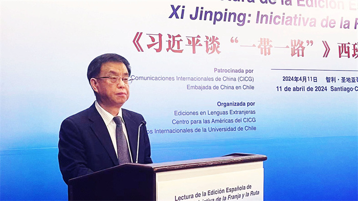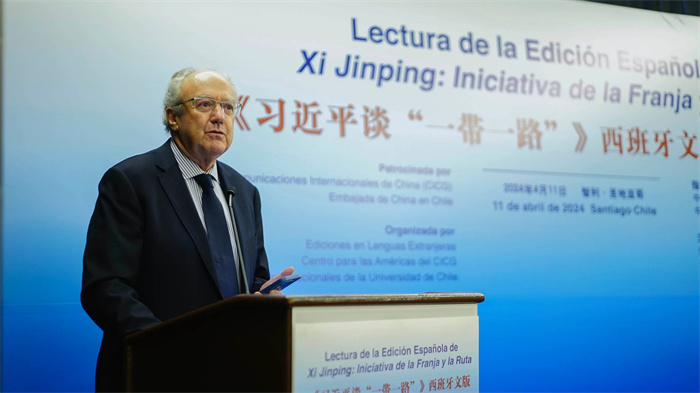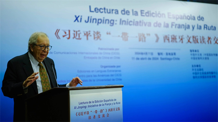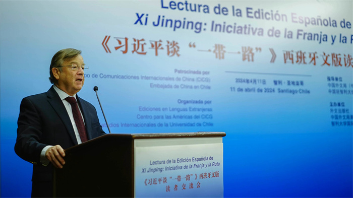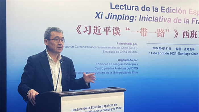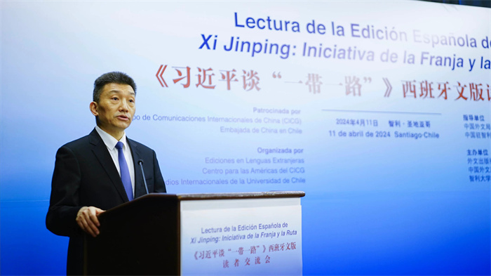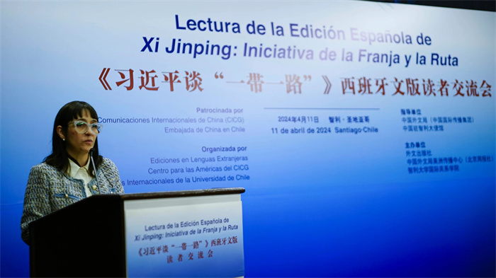 當地時間4月11日上午,由中國外文局、中國駐智利大使館指導,外文出版社、中國外文局美洲傳播中心(北京周報社)、智利大學國際關系學院主辦的《習近平談“一帶一路”》西班牙文版讀者交流會在智利首都圣地亞哥舉行。