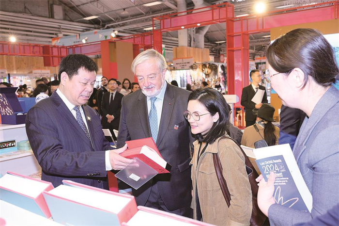 在2024法國巴黎國際博覽會“遇鑒中國”中華文化主題展,杜占元(左一)向國外嘉賓介紹中華文化產品。