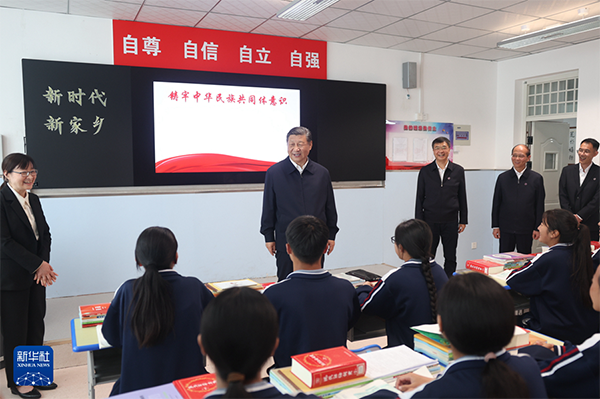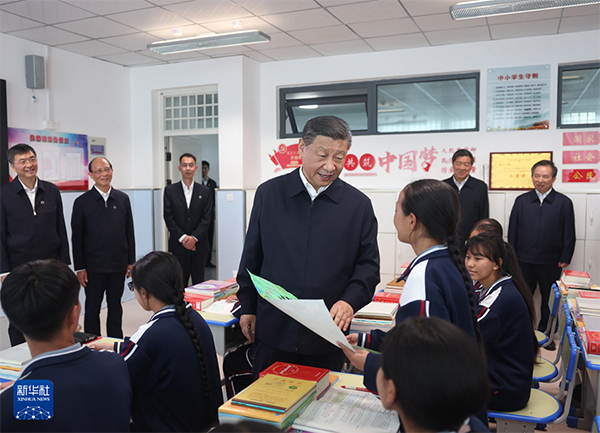 18日下午,習近平首先來到果洛西寧民族中學考察。這是一所隸屬于果洛藏族自治州的寄宿制中學,由上海市投資援建。習近平聽取上海等東部地區援助青海教育工作和學校建設情況介紹,詳細詢問學生構成、課程設置、體育鍛煉、普通話水平等情況,走進食堂、宿舍樓察看學生就餐和住宿條件,囑咐食堂工作人員一定要確保學生飲食安全、營養可口。之后,他來到高一(1)班教室,觀摩“新時代、新家鄉”主題思政課。了解到學校將思政課內容融入日常教學,聽了孩子們講述新時代家鄉的可喜變化,看了孩子們的畫作,習近平十分高興。他說,包括教育在內的東西部協作和對口支援取得顯著成效,充分彰顯了中國共產黨領導和中國特色社會主義制度的優勢,充分體現了中華民族大家庭的溫暖。要把鑄牢中華民族共同體意識作為學校思政課的一個重點,講好中國共產黨和中國特色社會主義的故事,講好新時代以中國式現代化全面推進強國建設、民族復興偉業的故事,講好中華民族共同體和民族團結進步的故事,把中華民族共同體意識從小就植入孩子們的心靈。