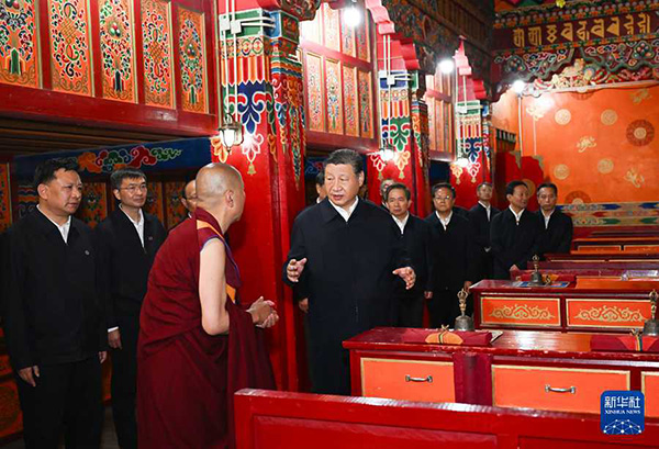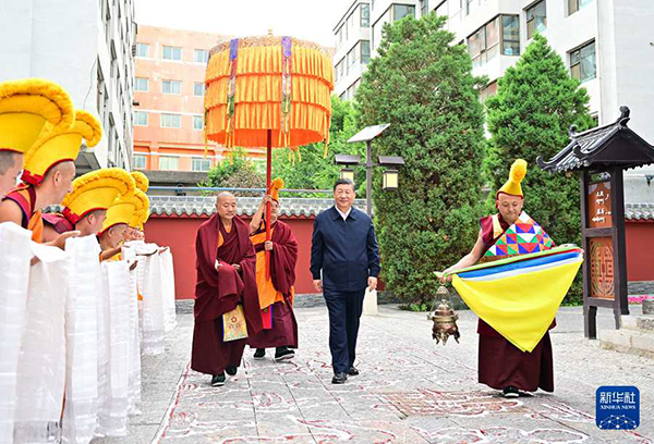 6月18日至19日,中共中央總書記、國家主席、中央軍委主席習近平在青??疾?。這是18日下午,習近平在位于西寧市城中區的宏覺寺考察。(新華社記者 謝環馳 攝)