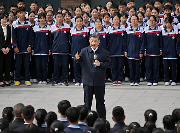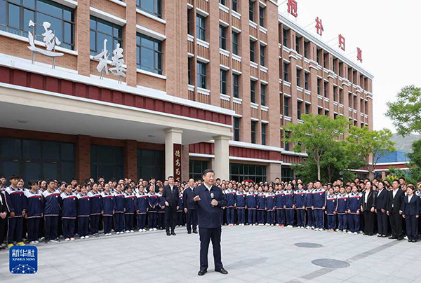 6月18日至19日,中共中央總書記、國家主席、中央軍委主席習近平在青??疾?。這是18日下午,習近平在果洛西寧民族中學考察時,同師生們親切交流。(新華社記者 燕雁 攝)