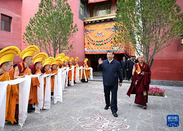 6月18日至19日,中共中央總書記、國家主席、中央軍委主席習近平在青??疾?。這是18日下午,習近平在位于西寧市城中區的宏覺寺考察。(新華社記者 翟健嵐 攝)