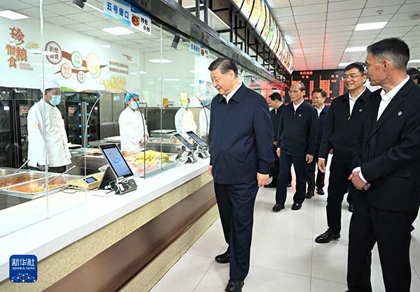 6月18日至19日,中共中央總書記、國家主席、中央軍委主席習近平在青??疾?。這是18日下午,習近平在果洛西寧民族中學食堂察看學生就餐條件。(新華社記者 謝環馳 攝)