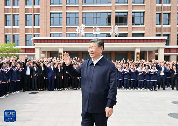 6月18日至19日,中共中央總書記、國家主席、中央軍委主席習近平在青??疾?。這是18日下午,習近平在果洛西寧民族中學考察時,向師生們揮手致意。(新華社記者 謝環馳 攝)