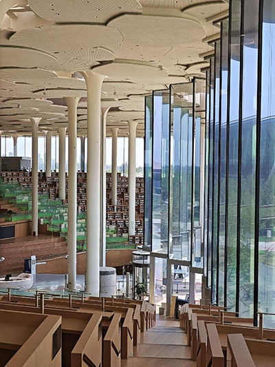 隨后,外籍專家們來到北京城市圖書館。這座巨大銀杏葉造型的建筑,每一處細節都凝聚著設計師的匠心,其空間布局既展現了中國傳統文化的韻味,又體現了現代人性化的設計理念。大面積的玻璃幕墻不僅引入自然光,更將森林與運河的美景融入圖書館內,為讀者營造了一個寧靜舒適的閱讀環境。在參觀過程中,外籍專家們還與圖書館的“智能管家”進行了互動體驗,感受到了科技在日常生活中的應用與魅力。