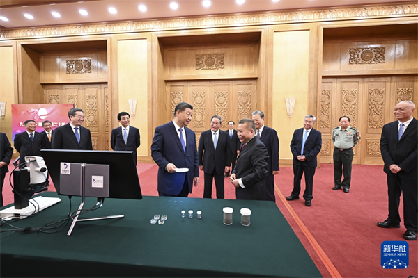 9月23日,黨和國家領導人習近平、李強、趙樂際、王滬寧、蔡奇、丁薛祥、李希等在人民大會堂接見探月工程嫦娥六號任務參研參試人員代表并參觀月球樣品和探月工程成果展覽。這是習近平等參觀月球樣品和探月工程成果展覽。(新華社記者 謝環馳 攝)