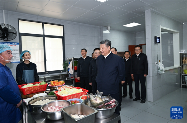 11月4日至6日,中共中央總書記、國家主席、中央軍委主席習近平在湖北考察。這是5日上午,習近平在咸寧市嘉魚縣潘家灣鎮四邑村養老服務驛站食堂考察。(新華社記者 謝環馳 攝)