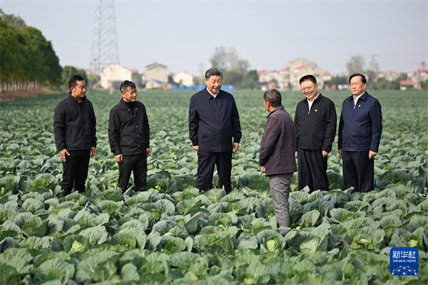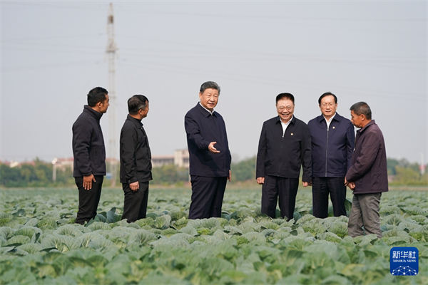 11月4日至6日,中共中央總書記、國家主席、中央軍委主席習近平在湖北考察。這是5日上午,習近平在咸寧市嘉魚縣潘家灣鎮十里蔬菜長廊考察時,走進田間,察看蔬菜長勢。(新華社記者 謝環馳 攝)