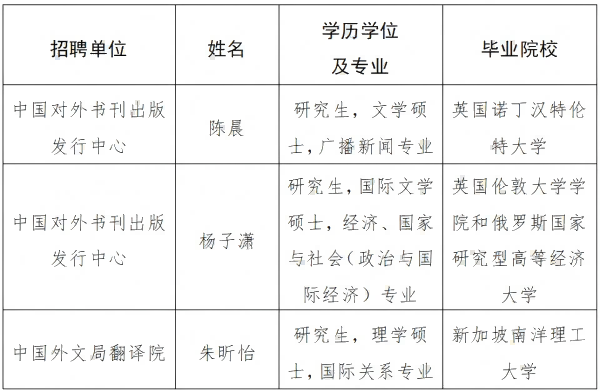 中國外文出版發行事業局所屬中國對外書刊出版發行中心、中國外文局翻譯院接收海外留學生公示