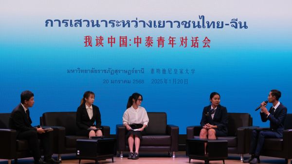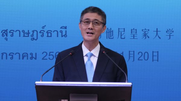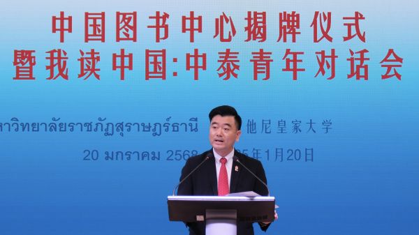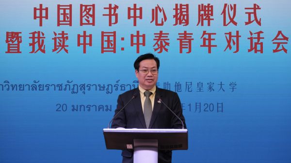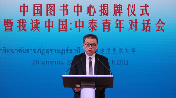 1月20日,泰國素叻他尼皇家大學中國圖書中心揭牌儀式暨“我讀中國:中泰青年對話會”活動在泰國素叻他尼皇家大學舉行。中國外文局總編輯高岸明、中國駐宋卡總領館代總領事張小溶、素叻他尼皇家大學校長瓦塔納·臘塔納鵬、亞太智庫主任威倫·披差翁帕迪等中泰嘉賓及中泰青年代表參加活動。