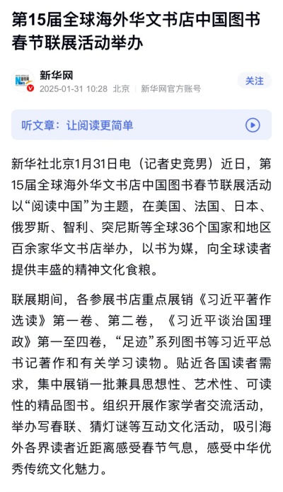 聯展期間,各參展書店重點展銷《習近平著作選讀》第一卷、第二卷,《習近平談治國理政》第一至四卷,“足跡”系列圖書等習近平總書記著作和有關學習讀物。貼近各國讀者需求,集中展銷一批兼具思想性、藝術性、可讀性的精品圖書。組織開展作家學者交流活動,舉辦寫春聯、猜燈謎等互動文化活動,吸引海外各界讀者近距離感受春節氣息和中華優秀傳統文化魅力。