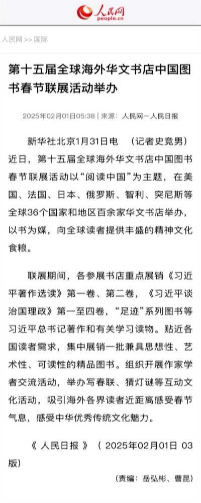 2024年12月,“春節——中國人慶祝傳統新年的社會實踐”列入聯合國教科文組織人類非物質文化遺產代表作名錄,中國春節日益走向世界,世界也張開雙臂擁抱中國春節。第十五屆全球海外華文書店中國圖書春節聯展活動與闔家團圓、萬象更新的中國傳統節日交相輝映,國圖集團在聯展期間組織了形式多樣的文化活動,如中國傳統文化圖書展示、《中國為何能居世界非遺榜首》專題講座、“中國地方文化之旅”讀者沙龍、“我去過最美的中國景點”征文比賽等,促進春節文化被不同膚色和語言的人們知曉喜愛。