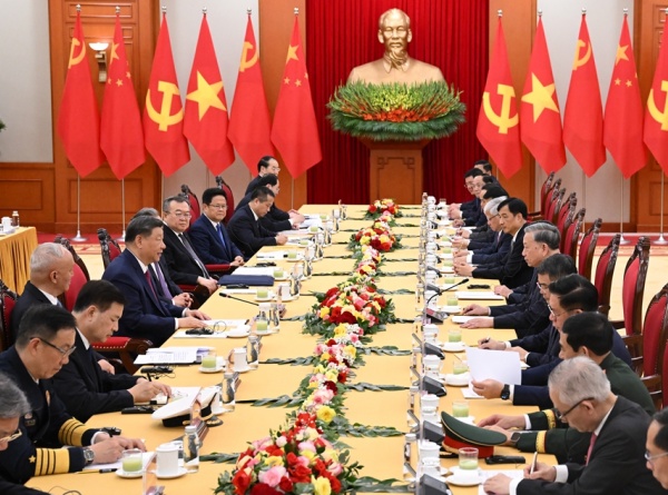 4月14日下午,中共中央總書記、國家主席習近平在越共中央駐地同越共中央總書記蘇林舉行會談。(新華社記者 謝環馳 攝)