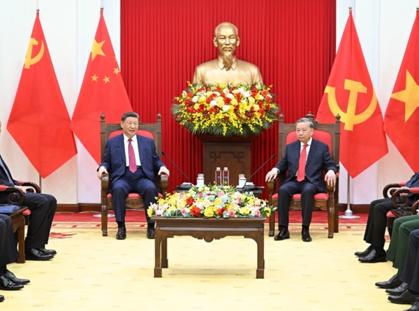 習近平指出,很高興對越南進行國事訪問,實現同蘇林總書記的首輪互訪。今年是越南共產黨成立95周年、越南建國80周年和南方解放50周年,我代表中國共產黨和中國政府向越方致以熱烈祝賀。中方將一如既往支持越南走好符合本國國情的社會主義道路,勝利召開2026年越共十四大,朝著建黨建國“兩個一百年”奮斗目標不斷邁進。