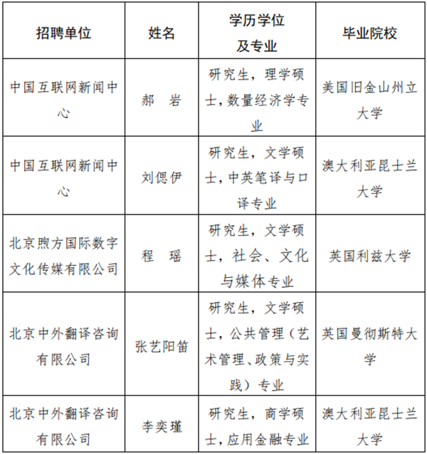 中國外文出版發行事業局所屬中國互聯網新聞中心、北京煦方國際數字文化傳媒有限公司、中外翻譯公司接收海外留學生公示