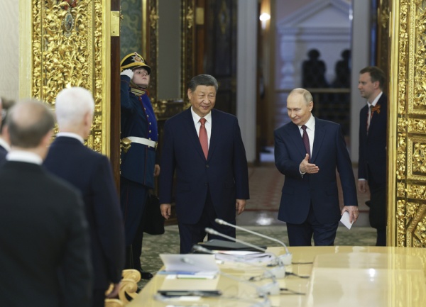 當地時間5月8日上午,俄羅斯總統普京同中國國家主席習近平在莫斯科克里姆林宮舉行會談。這是兩國元首步入會場。(新華社記者 王曄 攝)