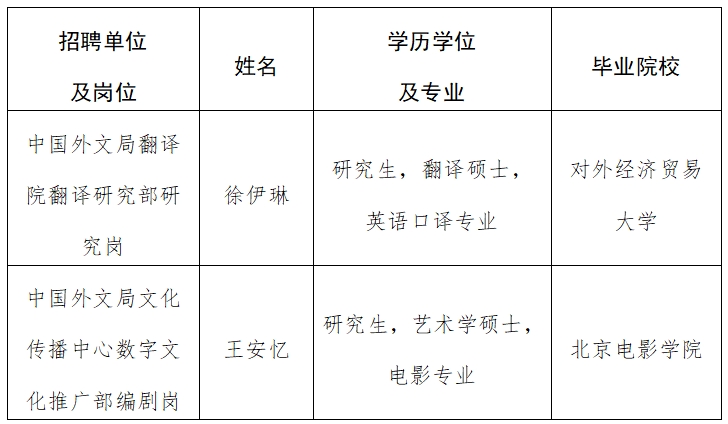 中國外文局翻譯院、中國外文局文化傳播中心2025年公開招聘擬聘用人員公示