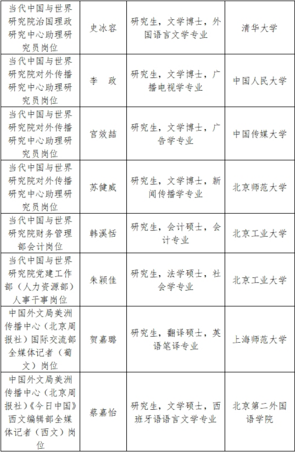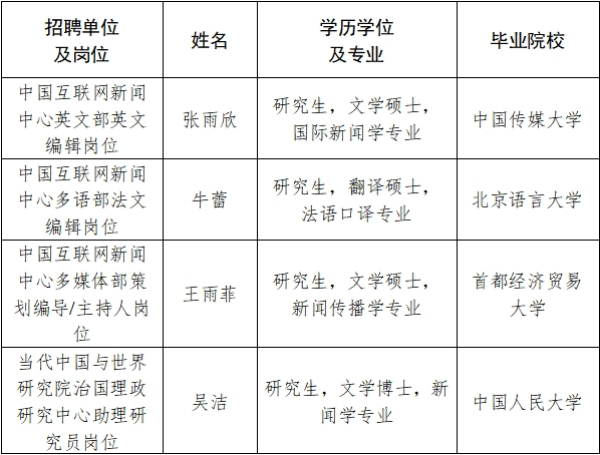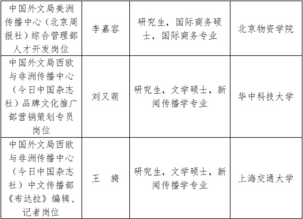 根據事業單位公開招聘工作有關規定和《中國外文出版發行事業局所屬企事業單位2025年度公開招聘工作人員公告》,現將我局所屬中國互聯網新聞中心、當代中國與世界研究院、中國外文局美洲傳播中心(北京周報社)、中國外文局西歐與非洲傳播中心(今日中國雜志社)等4家單位2025年度擬聘用事業單位工作人員予以公示。公示期間,如有問題,請向我局反映。