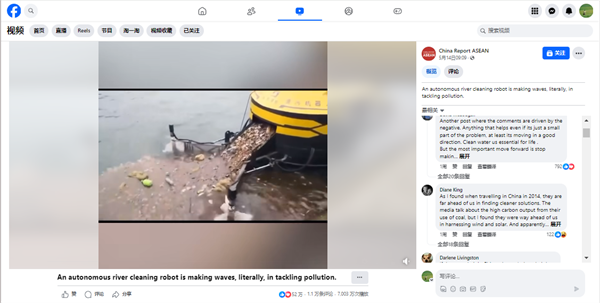中國東盟報道英文臉書賬號發布水上清污機器人作業視頻